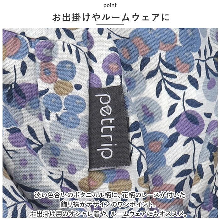 ・淡い色合いのボタニカル柄に、花柄のレースが付いた飾り襟がデザインのワンポイント。お出掛け用のオシャレ着や、ルームウェアにもオススメ。