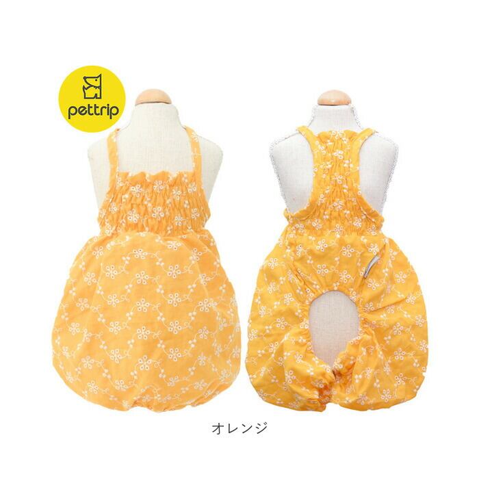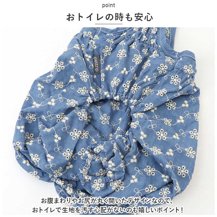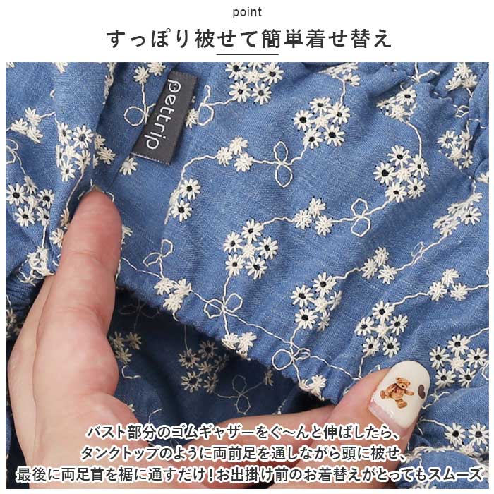 ・バスト部分のゴムギャザーをぐ~んと伸ばしたら、タンクトップのように両前足を通しながら頭に被せ、最後に両足首を裾に通すだけ!お出掛け前のお着替えがとってもスムーズ。