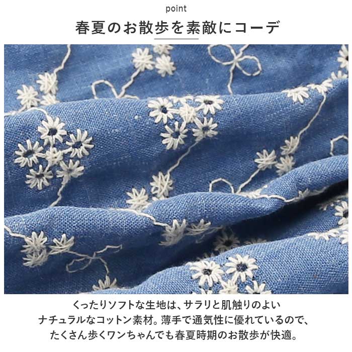 ・くったりソフトな生地は、サラリと肌触りのよいナチュラルなコットン素材。薄手で通気性に優れているので、たくさん歩くワンちゃんでも春夏時期のお散歩が快適。