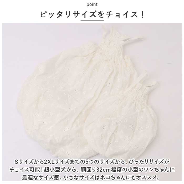 ・Sサイズから2XLサイズまでの5つのサイズから、ぴったりサイズがチョイス可能!超小型犬から、胴回り32cm程度の小型のワンちゃんに最適なサイズ感。小さなサイズはネコちゃんにもオススメ。