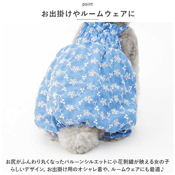 ・お尻がふんわり丸くなったバルーンシルエットに、小花刺繍が映える女の子らしいデザイン。お出掛け用のオシャレ着や、ルームウェアにも最適♪