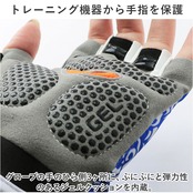 ・グローブの手のひら側3ヶ所に、ぷにぷにと弾力性のあるジェルクッションを内蔵。ダンベルやバーベル運動など、ハードなトレーニング時の擦り切れから手指を優しく保護。