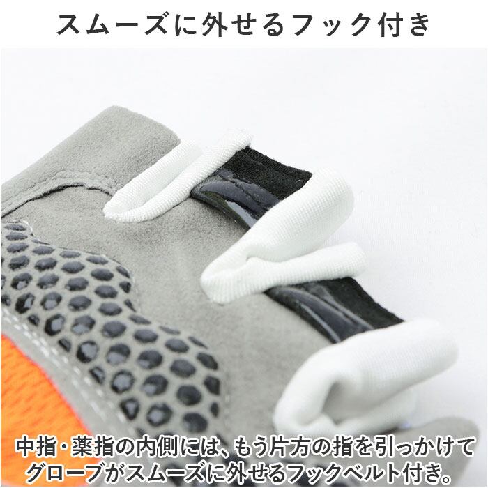 ・中指・薬指の内側には、もう片方の指を引っかけてグローブがスムーズに外せるフックベルト付き。特に擦り切れやダメージを受けやすい指の腹の保護にも効果的。