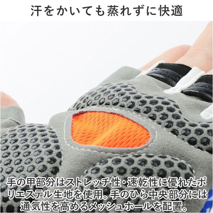 ・手の甲部分はストレッチ性・速乾性に優れたポリエステル生地を使用。手のひら中央部分には通気性を高めるメッシュホールを配置し、トレーニング中も蒸れずに快適。