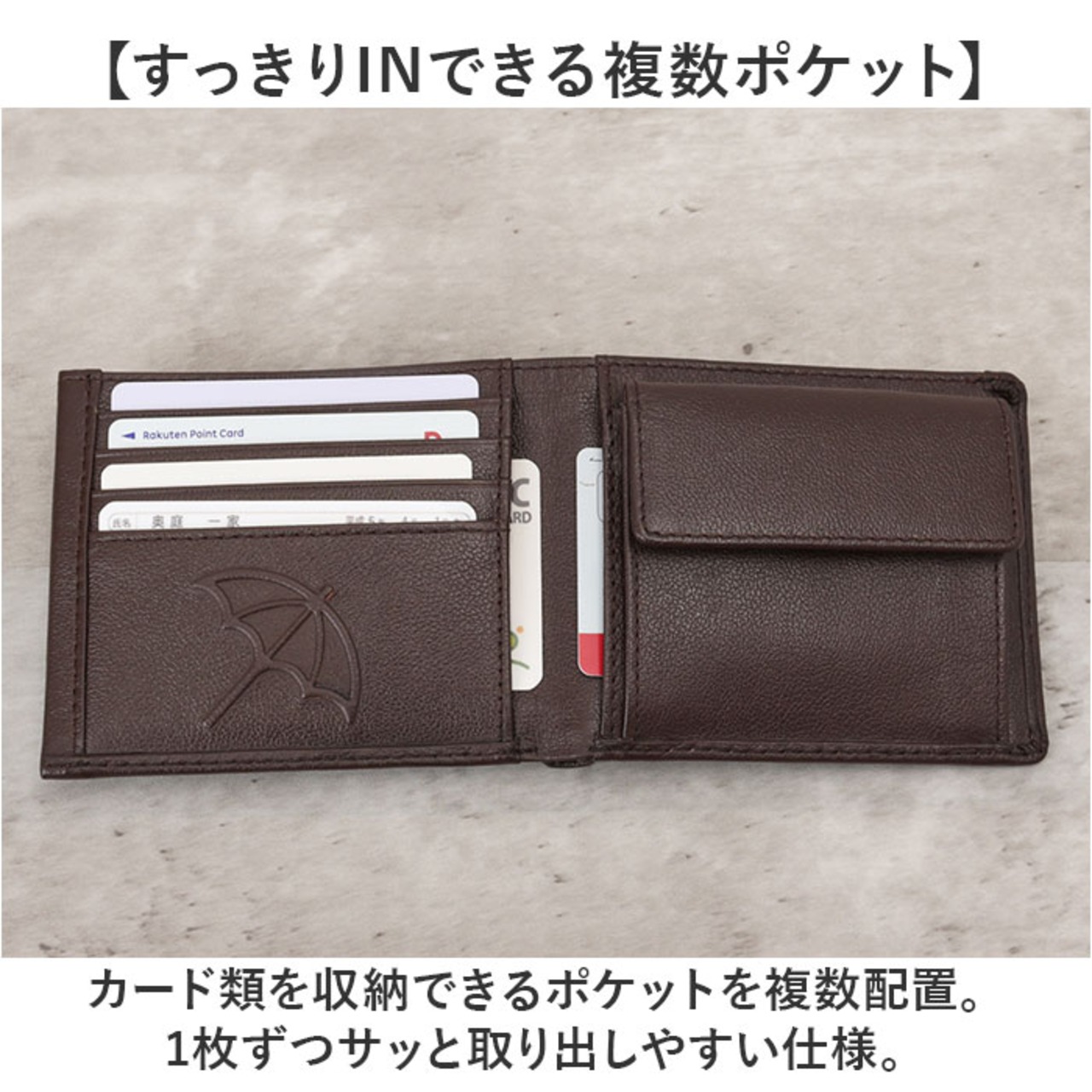 ・カード類を収納できるポケットを複数配置。1枚ずつサッと取り出しやすい仕様。