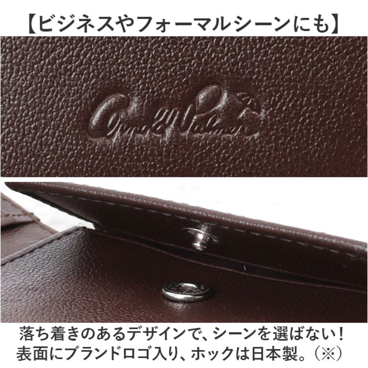 ・落ち着きのあるデザインで、シーンを選ばない!表面にブランドロゴ入り、ホックは日本製。