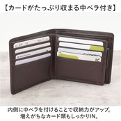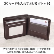 ・内側:スナップボタン式小銭入れ×1、お札入れ×3、カードポケット×13(2つはお札入れ内に配置)、クリア窓ポケット×1、フリーポケット×1