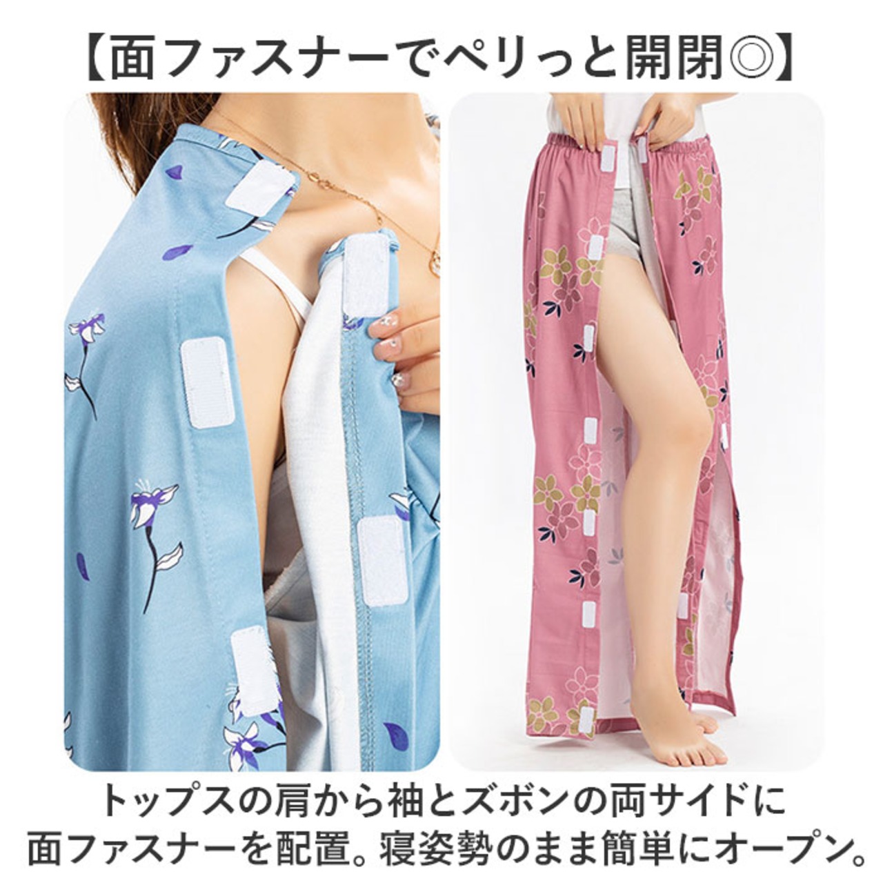 ・トップスの肩から袖とズボンの両サイドに面ファスナーを配置。寝姿勢のまま簡単にオープン。
