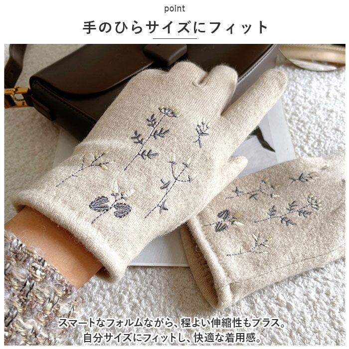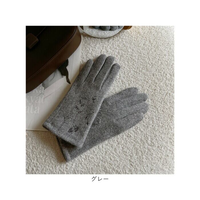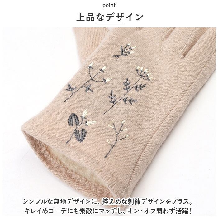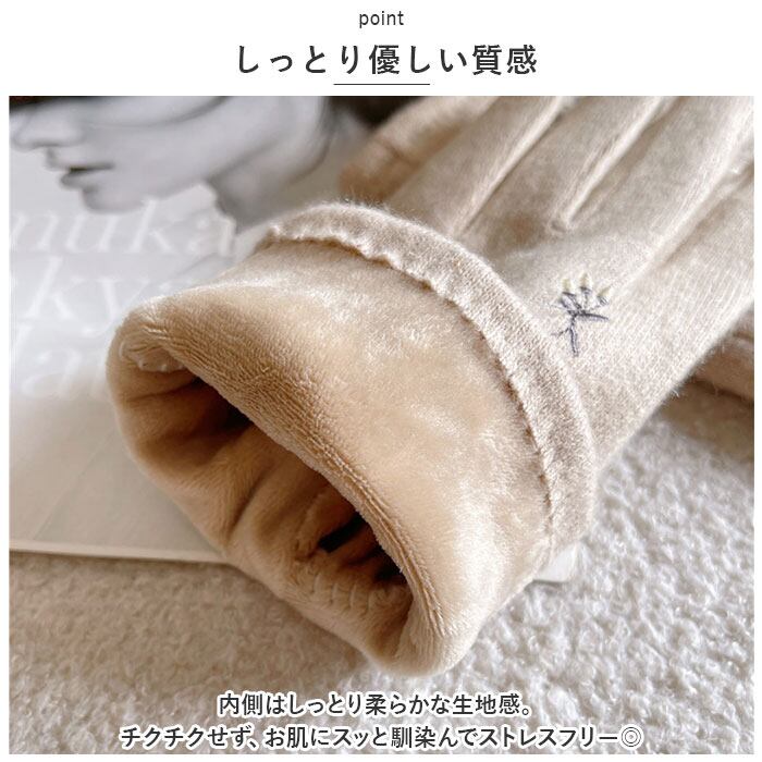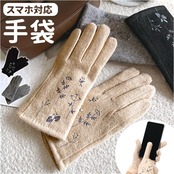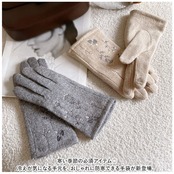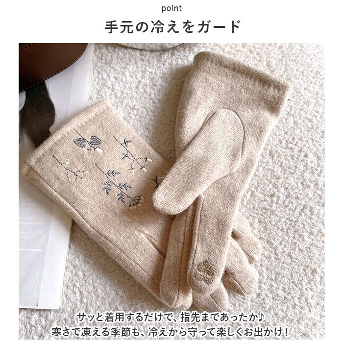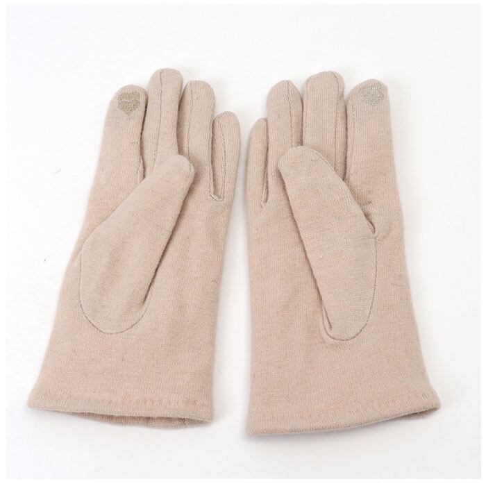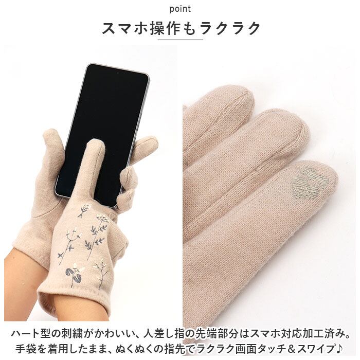 ・ハート型の刺繍がかわいい、人差し指の先端部分はスマホ対応加工済み。手袋を着用したまま、ぬくぬくの指先でラクラク画面タッチ&スワイプ♪