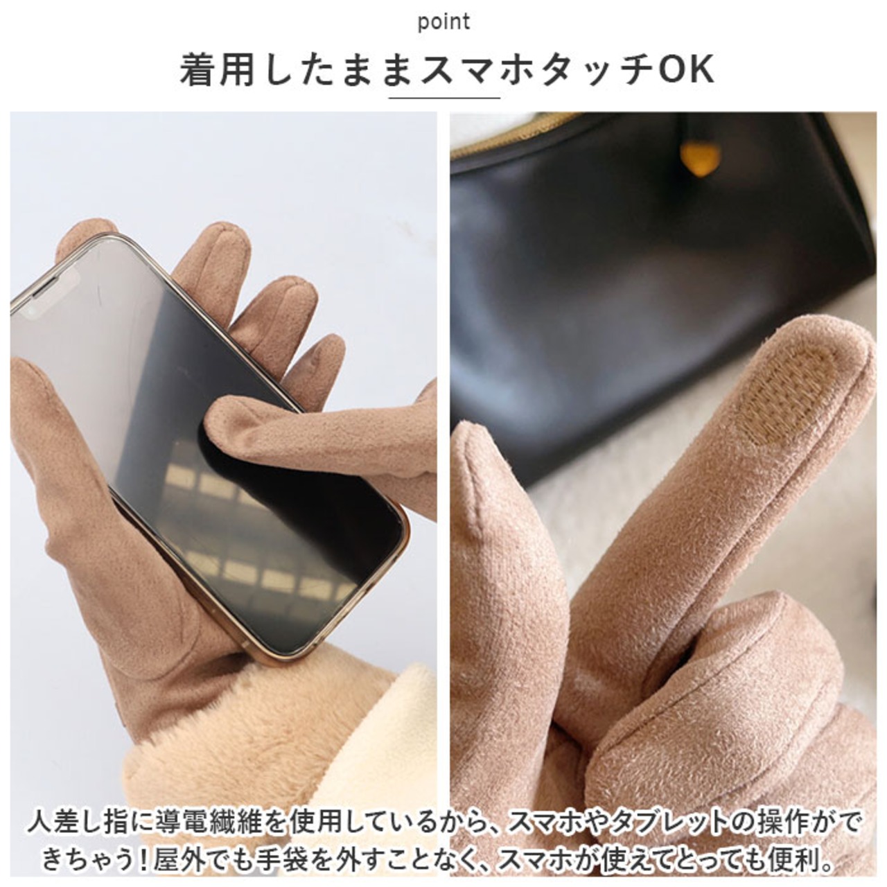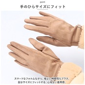 ・人差し指に導電繊維を使用しているから、スマホやタブレットの操作ができちゃう!屋外でも手袋を外すことなく、スマホが使えてとっても便利。