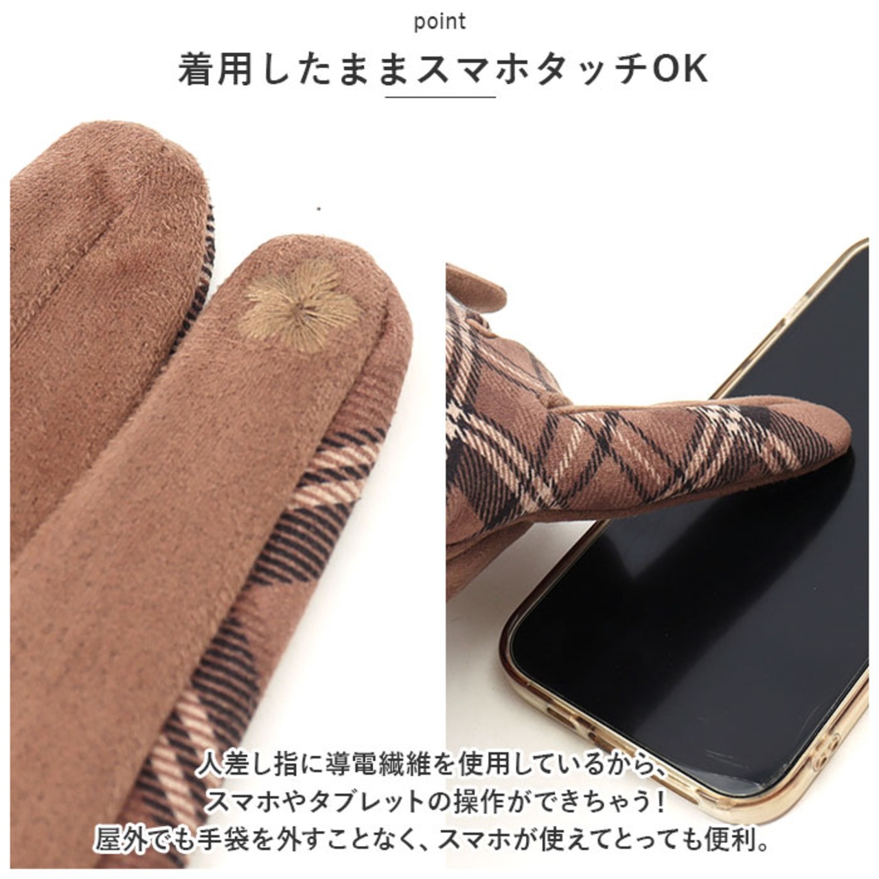 ・人差し指に導電繊維を使用しているから、スマホやタブレットの操作ができちゃう!屋外でも手袋を外すことなく、スマホが使えてとっても便利。