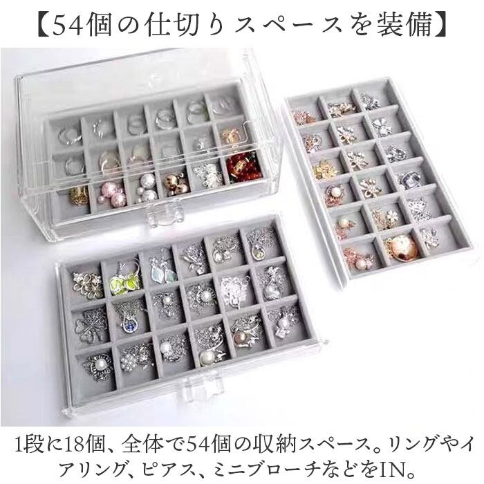 ・1段に18個、全体で54個の収納スペース。リングやイアリング、ピアス、ミニブローチなどをIN。