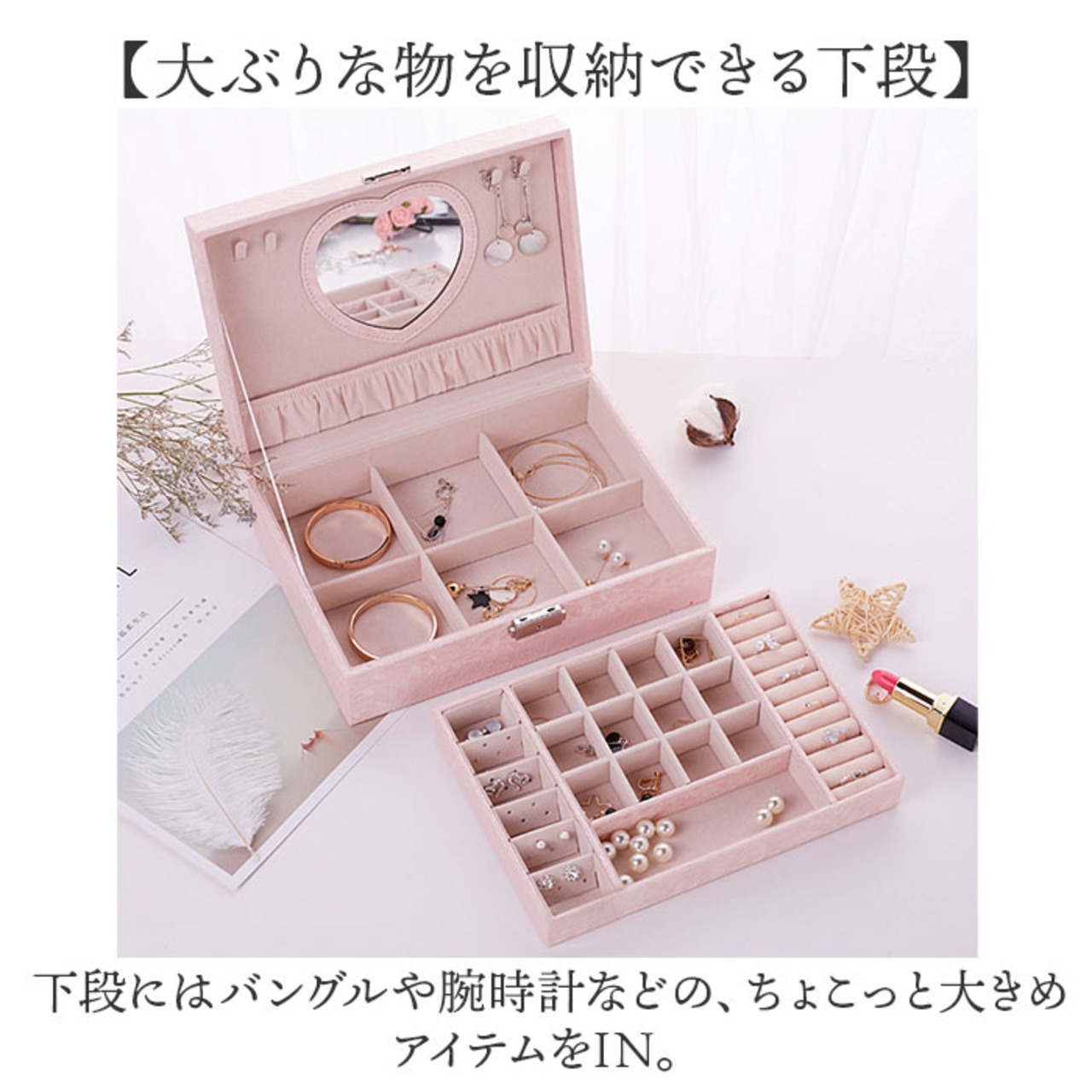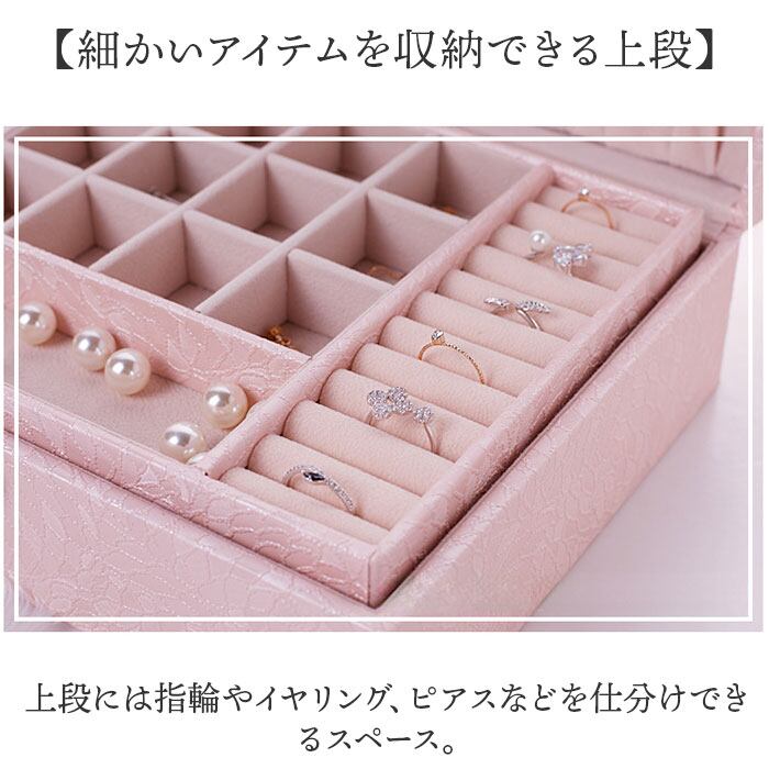 ・上段には指輪やイヤリング、ピアスなどを仕分けできるスペース。