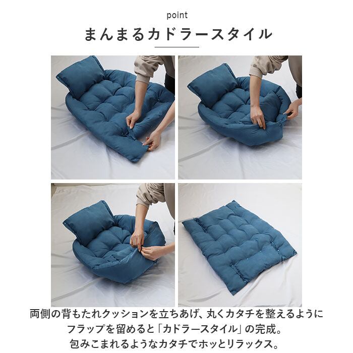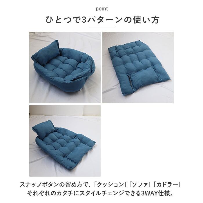 ・スナップボタンの留め方で、「クッション」「ソファ」「カドラー」それぞれのカタチにスタイルチェンジできる3WAY仕様。