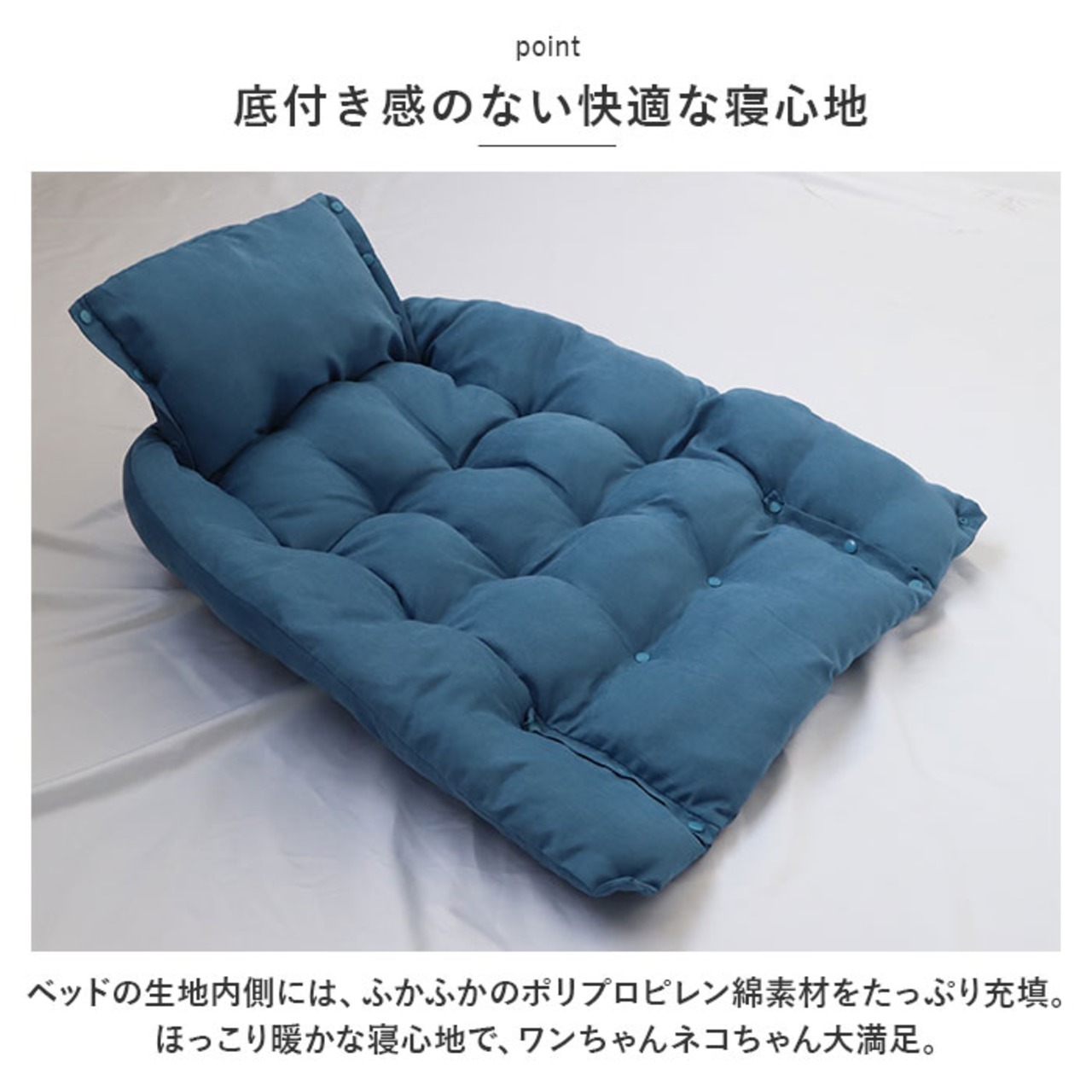 ・ベッドの生地内側には、ふかふかのポリプロピレン綿素材をたっぷり充填。ほっこり暖かな寝心地で、ワンちゃんネコちゃん大満足。