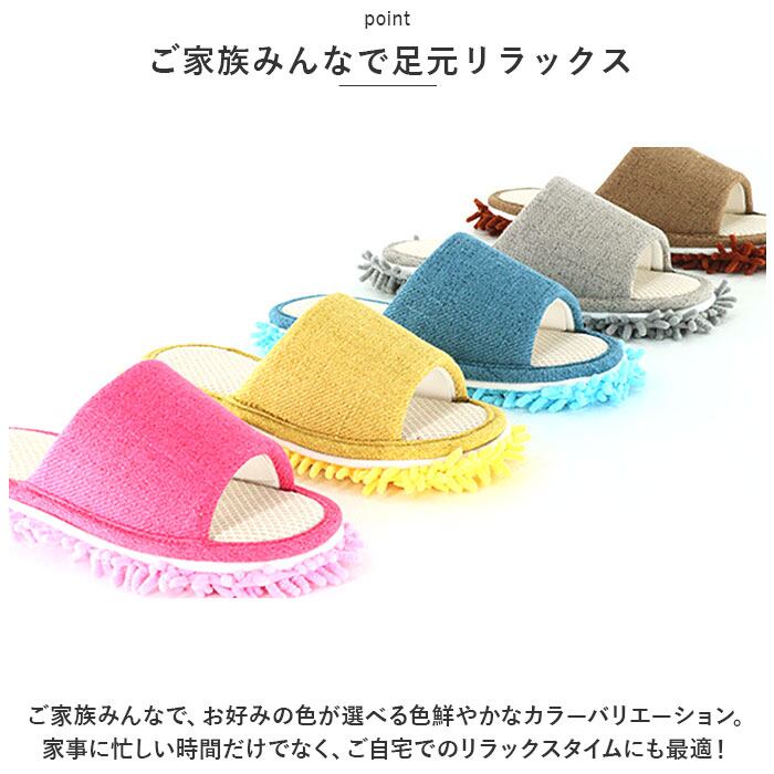 ・裏面がふわふわ・もこもこのモップになったカラフル&ユニークなお掃除スリッパ!お料理したり、家事をしている間にいつのまにかお掃除できちゃう♪