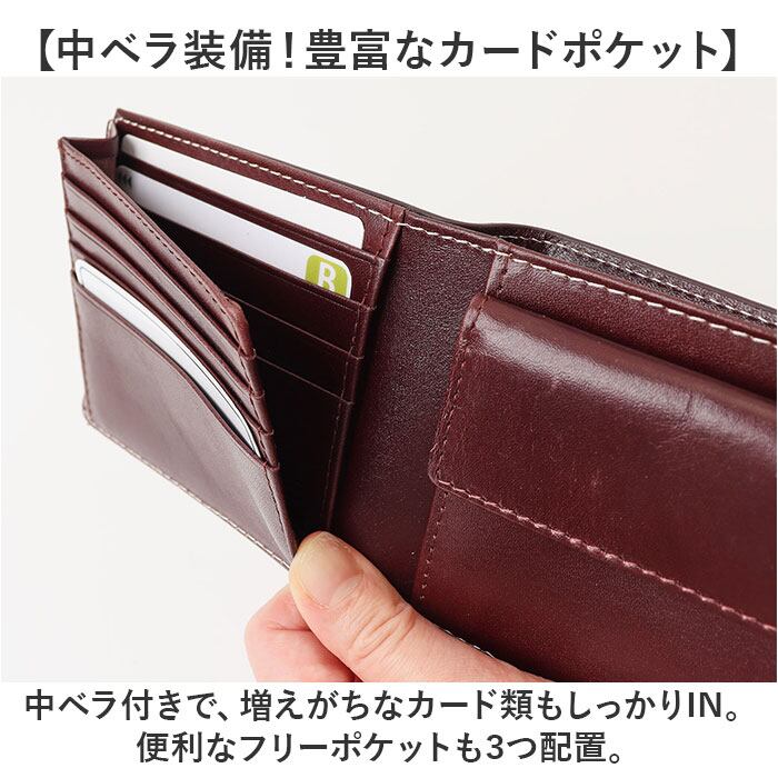 ・中ベラ付きで、増えがちなカード類もしっかりIN。便利なフリーポケットも3つ配置。