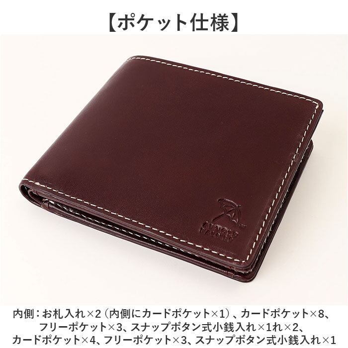 ・内側:お札入れ×2(内側にカードポケット×1)、カードポケット×8、フリーポケット×3、スナップボタン式小銭入れ×1