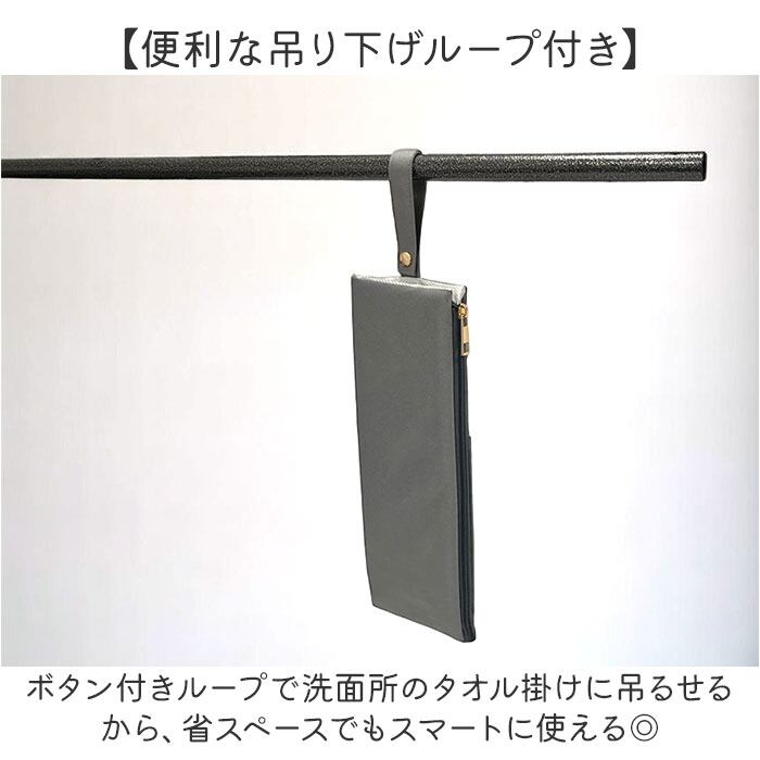 ・ボタン付きループで洗面所のタオル掛けに吊るせるから、省スペースでもスマートに使える◎