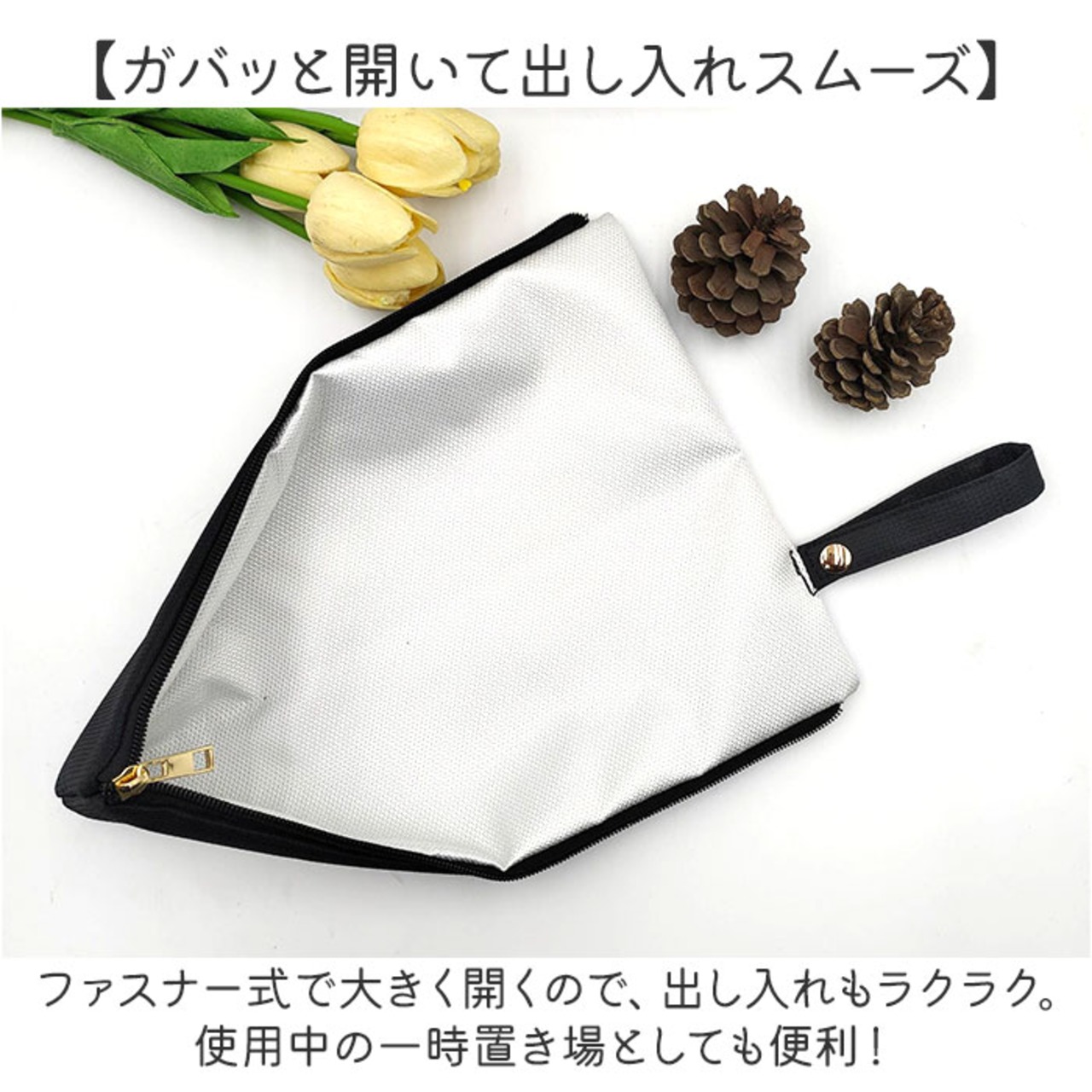 ・ファスナー式で大きく開くので、出し入れもラクラク。使用中の一時置き場としても便利!
