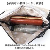 ・横幅のある作りで500mlのペットボトルや長財布の収納もO。