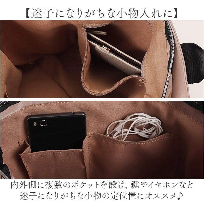 ・内外側に複数のポケットを設け、鍵やイヤホンなど迷子になりがちな小物の定位置にオススメ♪