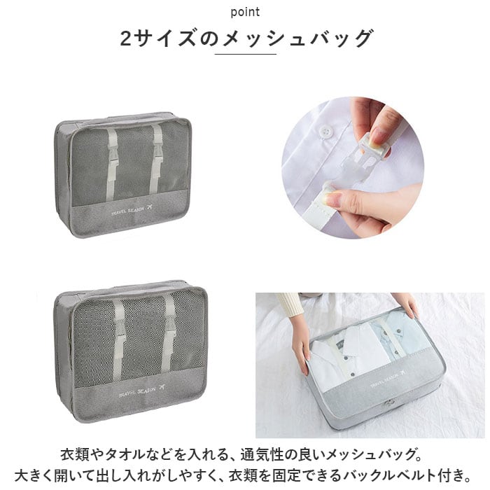 ・小物を上手に仕分けできる7個のポーチがセットに!何がどこに収納されているか把握しやすく、スーツケースの中がすっきり整頓できる便利アイテム◎(※メッシュバッグ、下着バッグ、靴袋に持ち手付き)