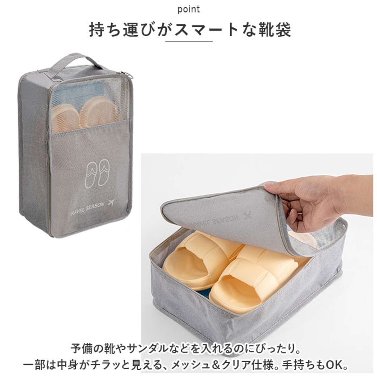 ・予備の靴やサンダルなどを入れるのにぴったり。一部は中身がチラッと見える、メッシュ&クリア仕様。手持ちもOK。