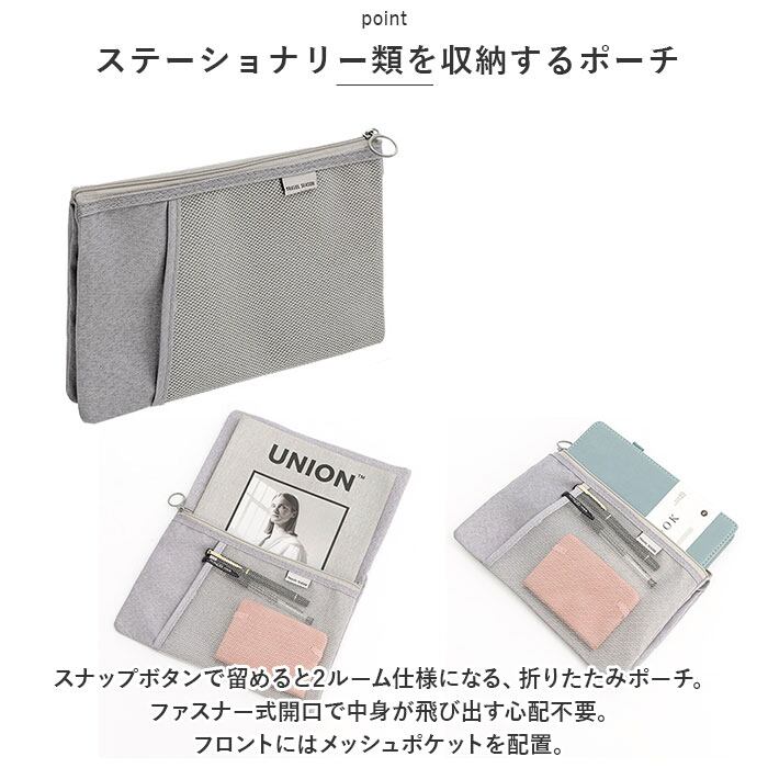 ・スナップボタンで留めると2ルーム仕様になる、折りたたみポーチ。ファスナー式開口で中身が飛び出す心配不要。フロントにはメッシュポケットを配置。