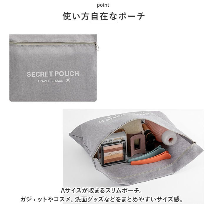 ・Aサイズが収まるスリムポーチ。ガジェットやコスメ、洗面グッズなどをまとめやすいサイズ感。