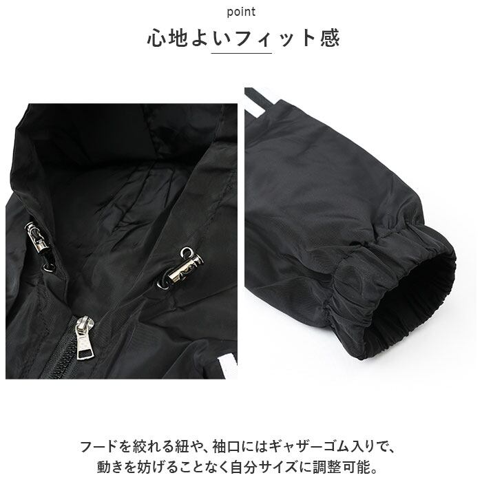 ・フードを絞れる紐や、袖口にはギャザーゴム入りで、動きを妨げることなく自分サイズに調整可能。