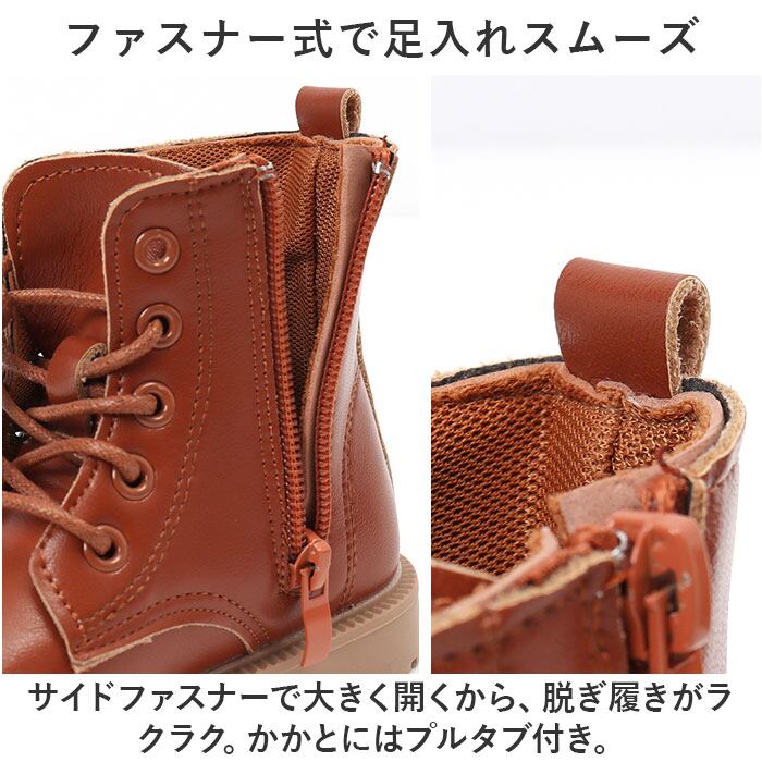 ・サイドファスナーで大きく開くから、脱ぎ履きがラクラク。かかとにはプルタブ付き。