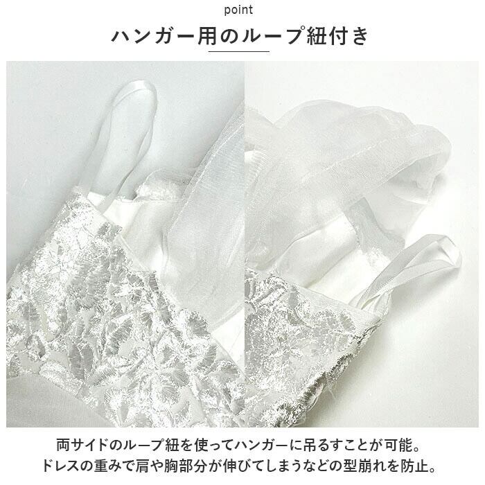 ・両サイドのループ紐を使ってハンガーに吊るすことが可能。ドレスの重みで肩や胸部分が伸びてしまうなどの型崩れを防止。