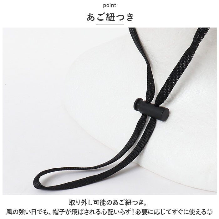 ・取り外し可能のあご紐つき。風の強い日でも、帽子が飛ばされる心配いらず!必要に応じてすぐに使える◎