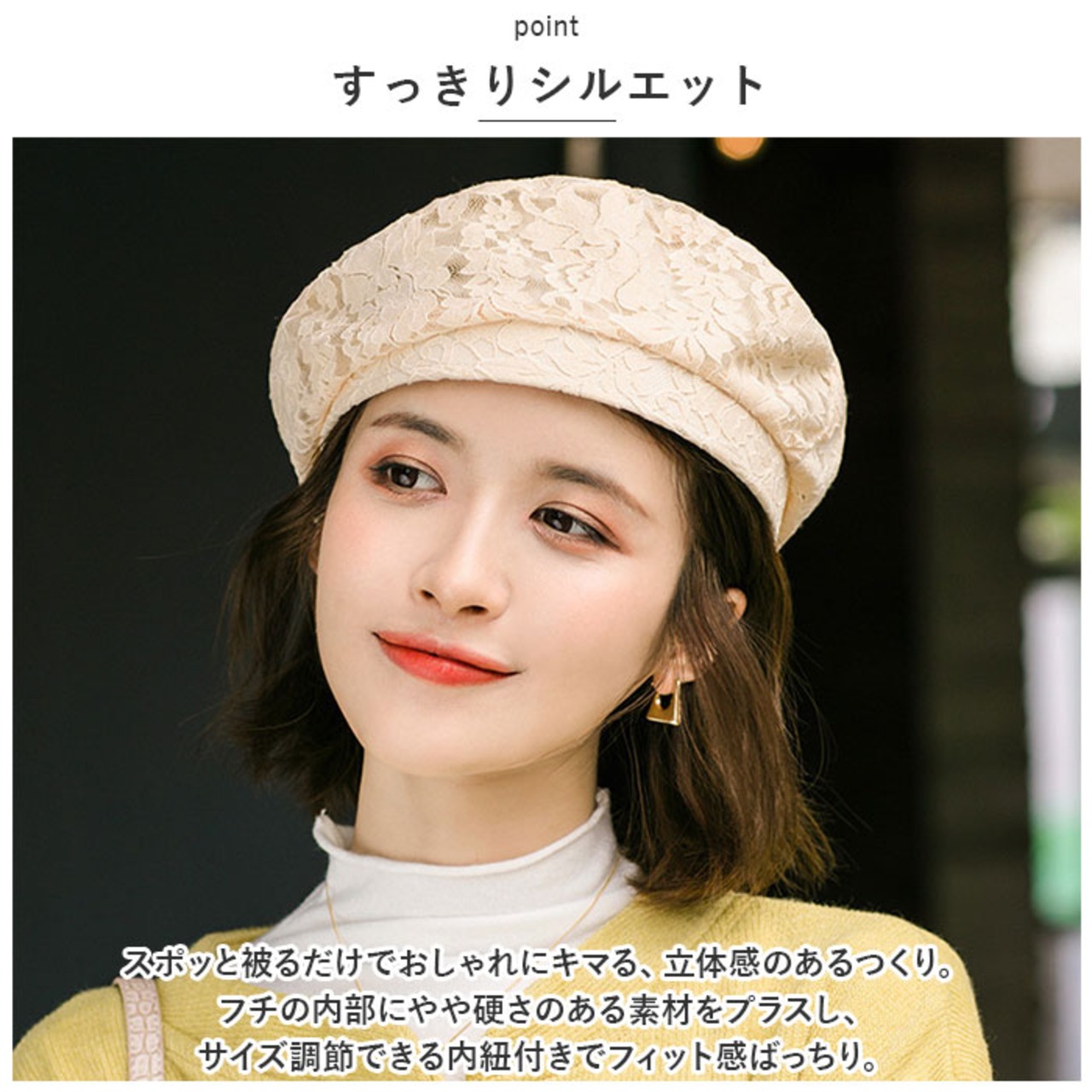 ・スポッと被るだけでおしゃれにキマる、立体感のあるつくり。フチの内部にやや硬さのある素材をプラスし、サイズ調節できる内紐付きでフィット感ばっちり。