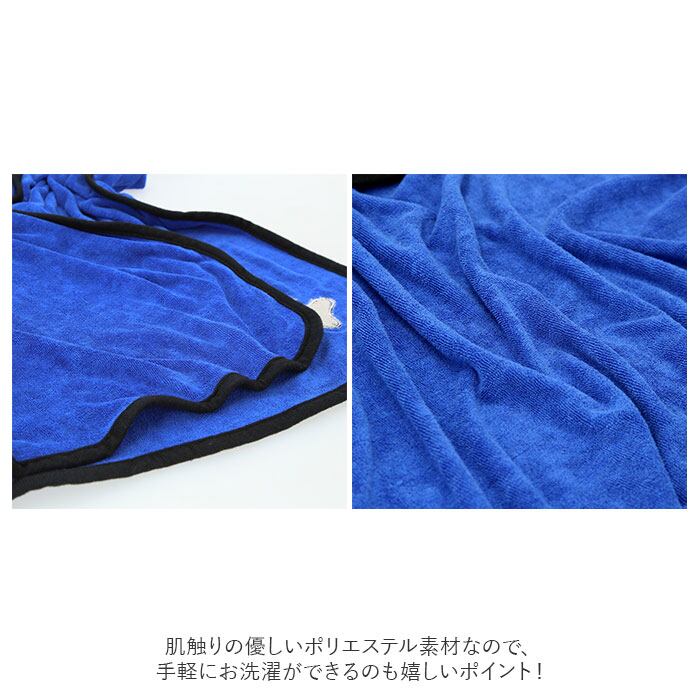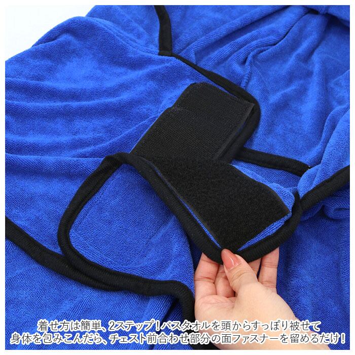 ・着せ方は簡単、2ステップ!バスタオルを頭からすっぽり被せて身体を包みこんだら、チェスト前合わせ部分の面ファスナーを留めるだけ!