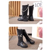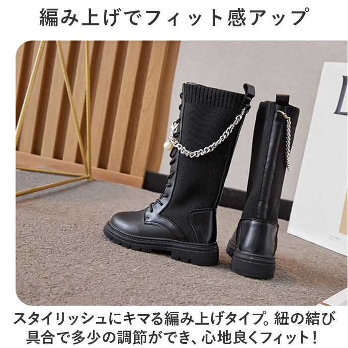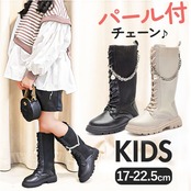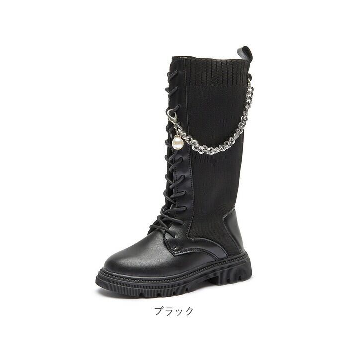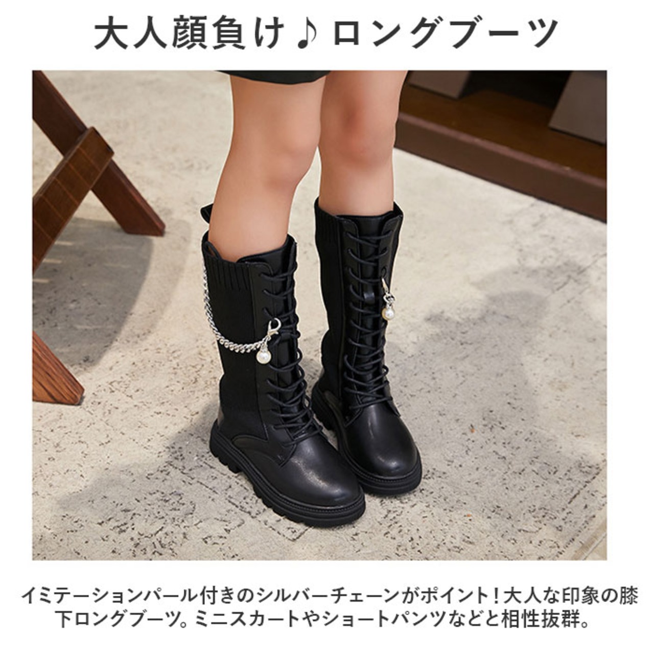 ・イミテーションパール付きのシルバーチェーンがポイント!大人な印象の膝下ロングブーツ。ミニスカートやショートパンツなどと相性抜群。