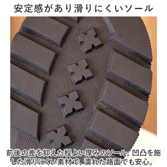 ・前後の差を抑えた程よい厚みのソール。凹凸を施した滑りにくい素材で、濡れた路面でも安心。