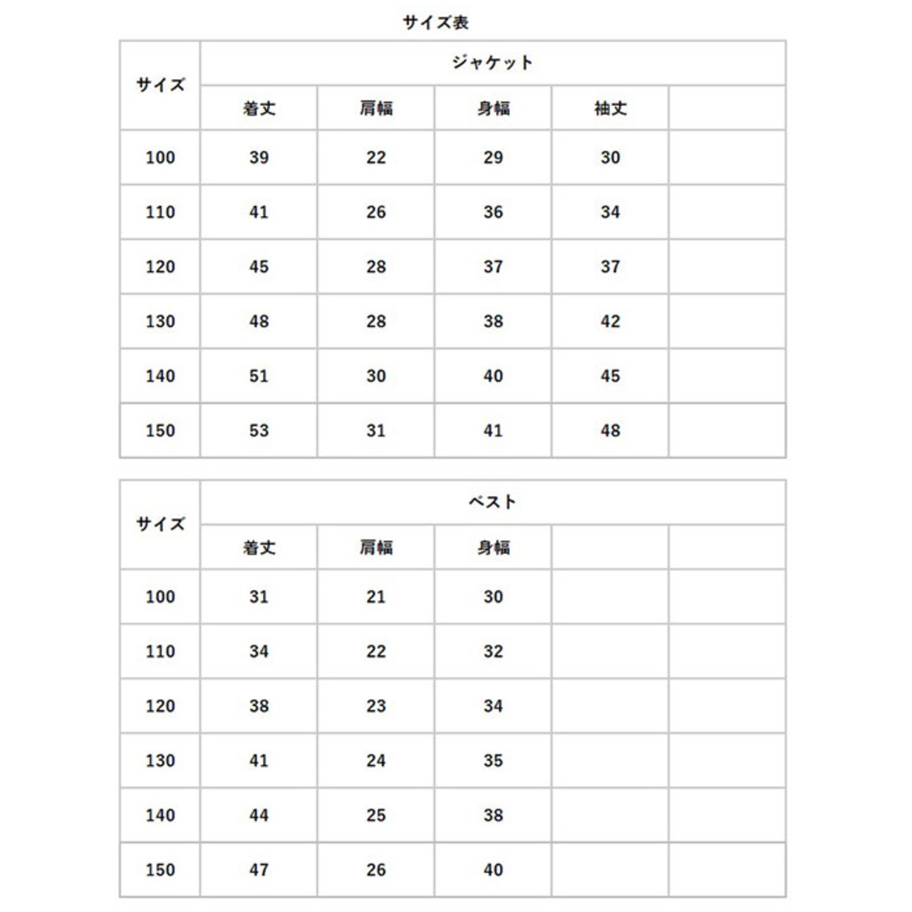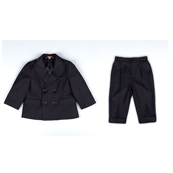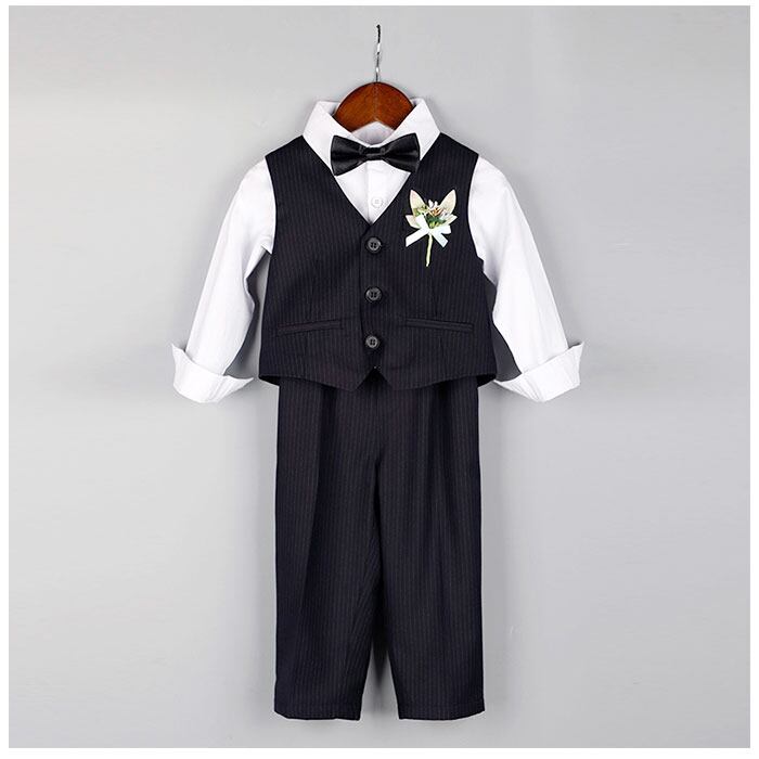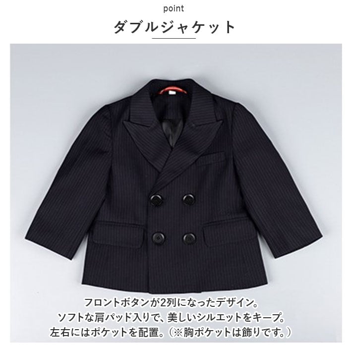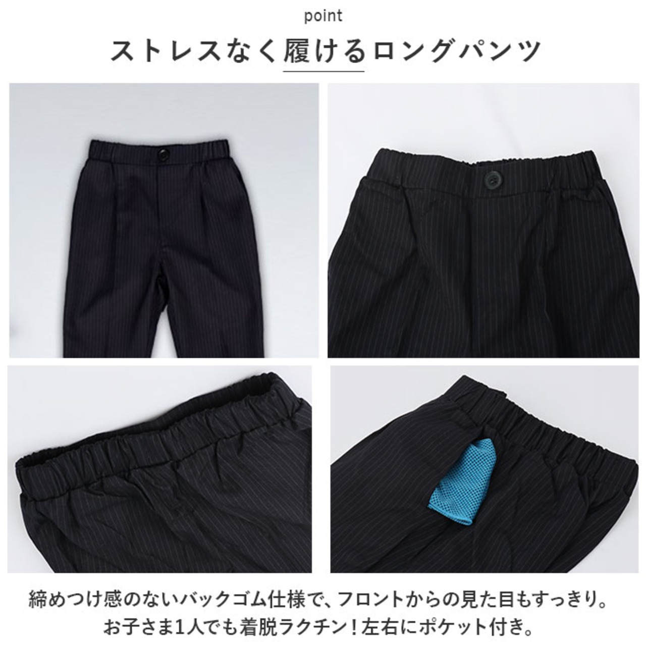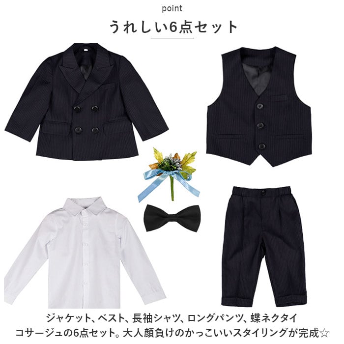 ・ジャケット、ベスト、長袖シャツ、ロングパンツ、蝶ネクタイ、コサージュの6点セット。大人顔負けのかっこいいスタイリングが完成☆