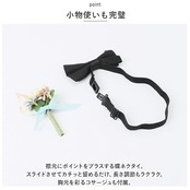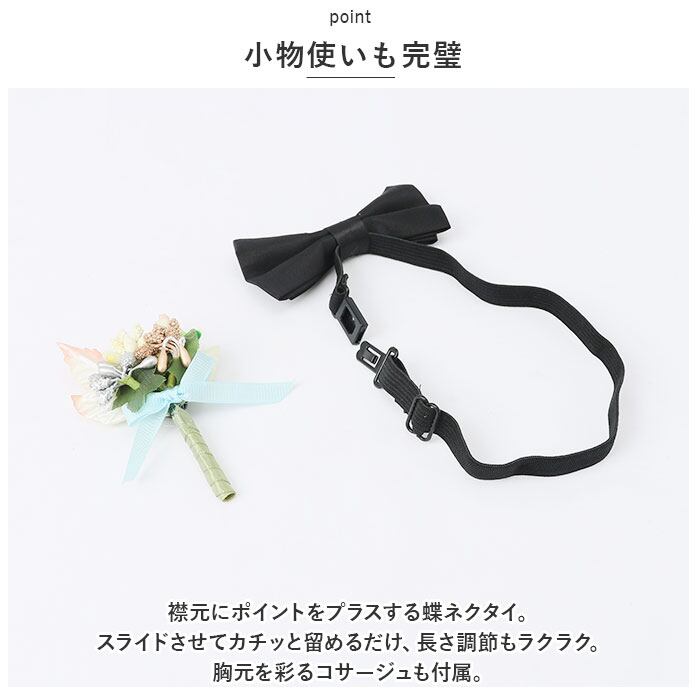 ・襟元にポイントをプラスする蝶ネクタイ。スライドさせてカチッと留めるだけ、長さ調節もラクラク。胸元を彩るコサージュも付属。