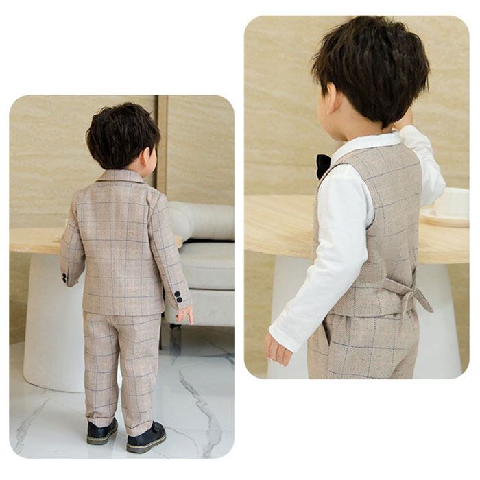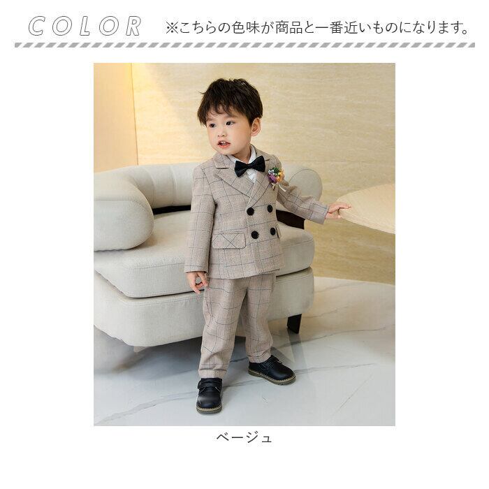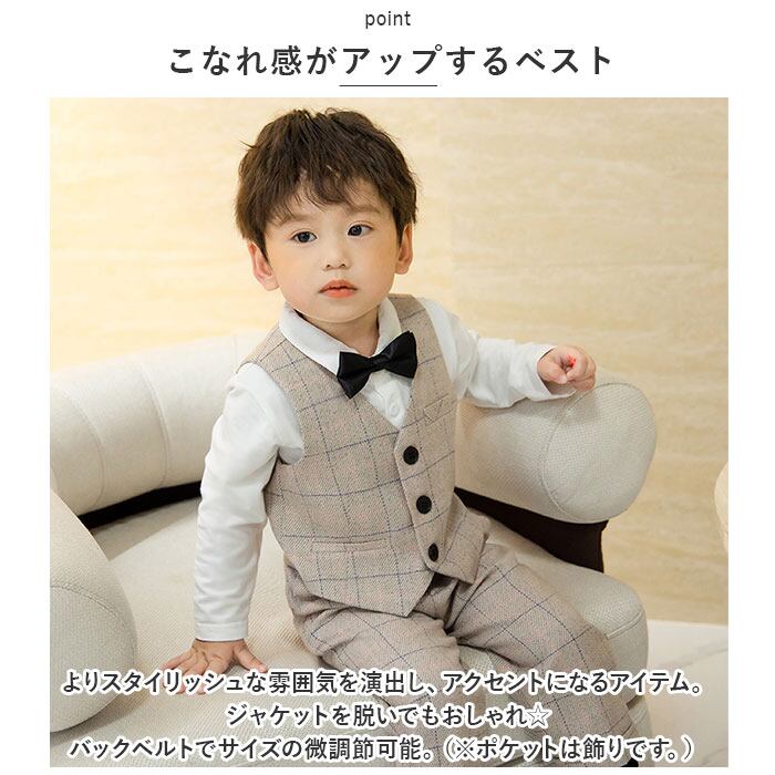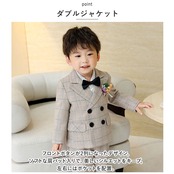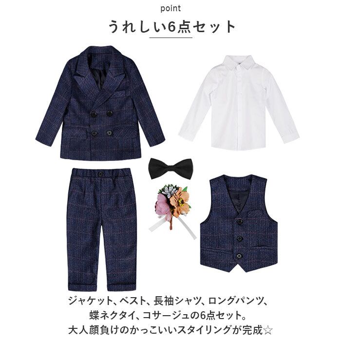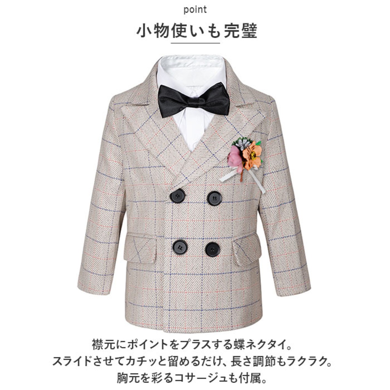 ・ジャケット、ベスト、長袖シャツ、ロングパンツ、蝶ネクタイ、コサージュの6点セット。大人顔負けのかっこいいスタイリングが完成☆