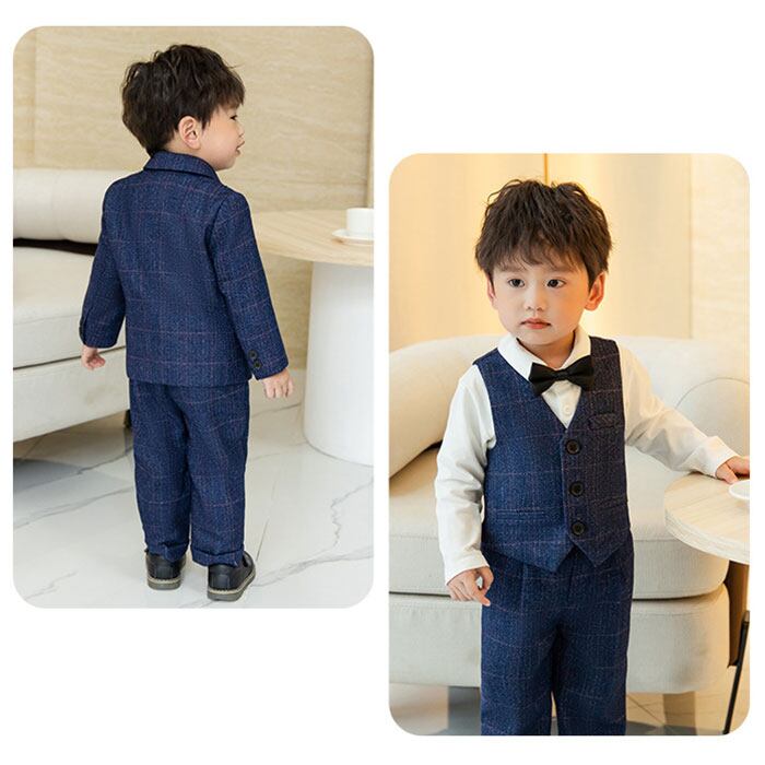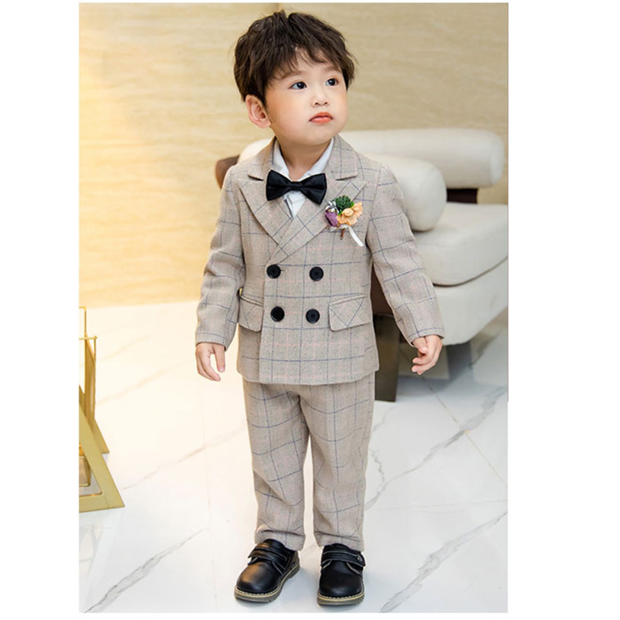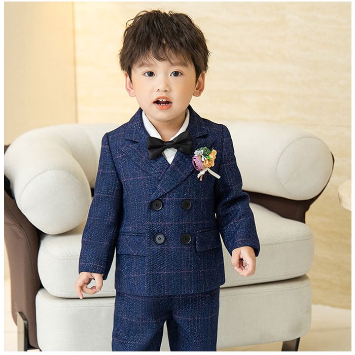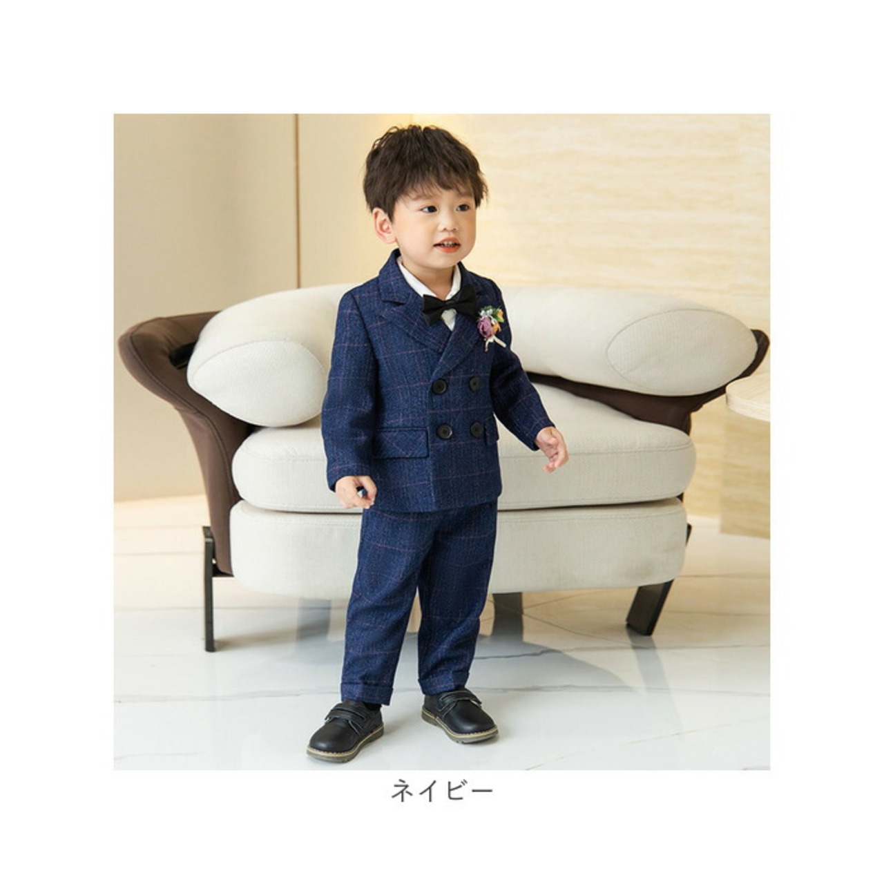 ・ジャケット、ベスト、長袖シャツ、ロングパンツ、蝶ネクタイ、コサージュの6点セット。大人顔負けのかっこいいスタイリングが完成☆