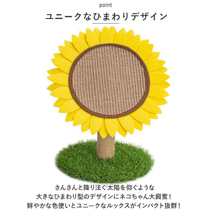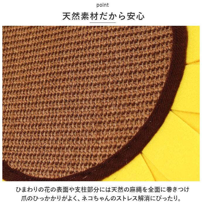 ・ひまわりの花の表面や支柱部分には天然の麻縄を全面に巻きつけ、爪のひっかかりがよく、ネコちゃんのストレス解消にぴったり。
