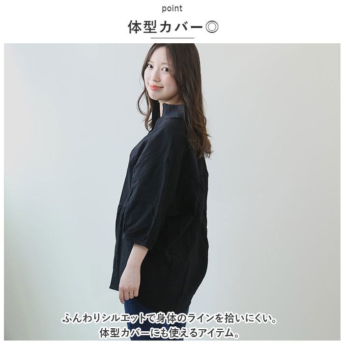 ・ふんわりシルエットで身体のラインを拾いにくい。体型カバーにも使えるアイテム。