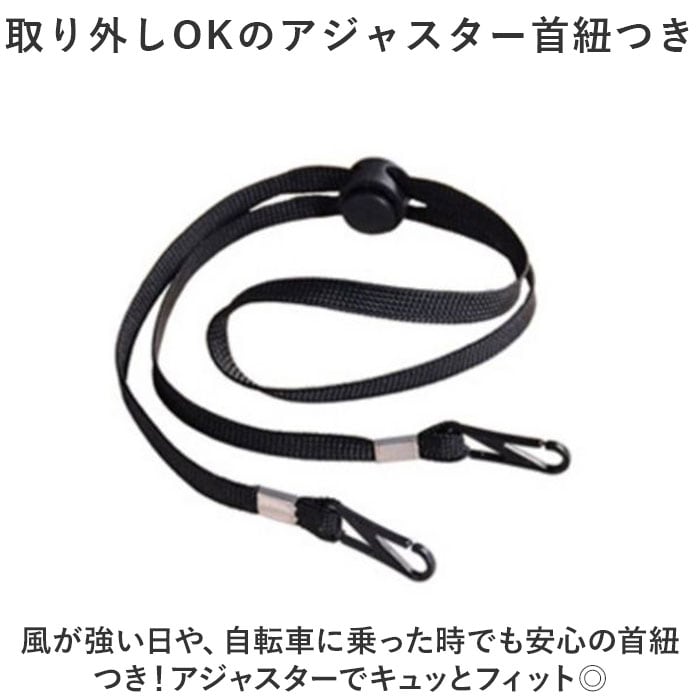 ・風が強い日や、自転車に乗った時でも安心の首紐つき!アジャスターでキュッとフィット◎