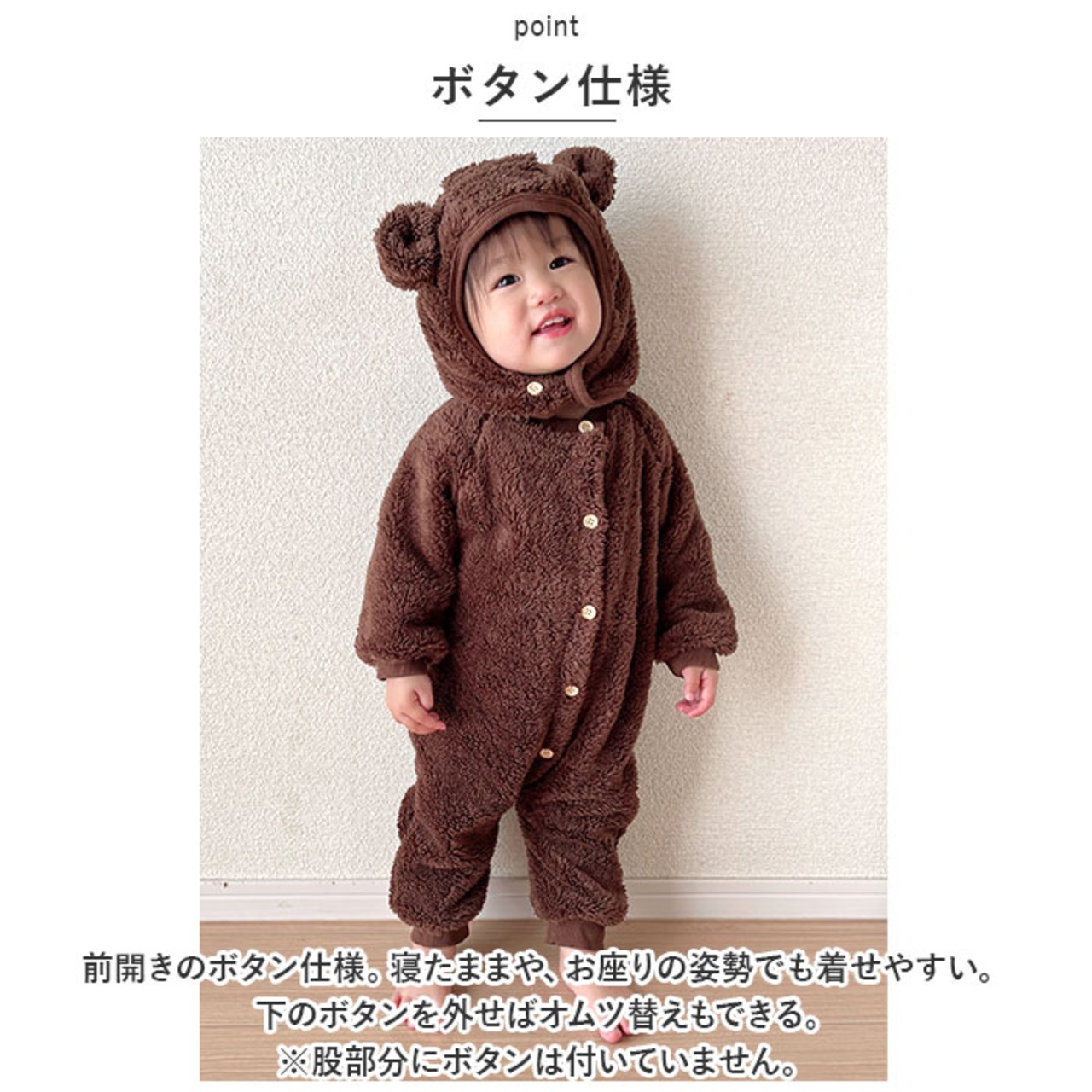 ・前開きのボタン仕様。寝たままや、お座りの姿勢でも着せやすい。下のボタンを外せばオムツ替えもできる。