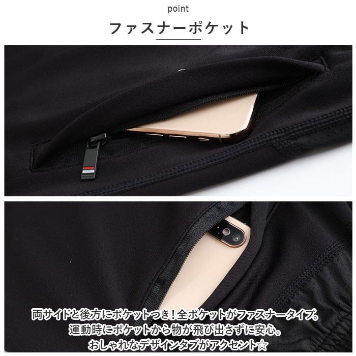 ・両サイドと後方にポケットつき!全ポケットがファスナータイプ。運動時にポケットから物が飛び出さずに安心。おしゃれなデザインタブがアクセント☆
