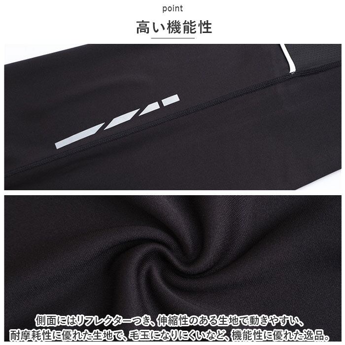 ・側面にはリフレクターつき、伸縮性のある生地で動きやすい、耐摩耗性に優れた生地で、毛玉になりにくいなど、機能性に優れた逸品。