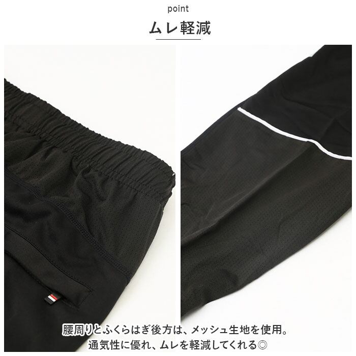 ・腰周りとふくらはぎ後方は、メッシュ生地を使用。通気性に優れ、ムレを軽減してくれる◎