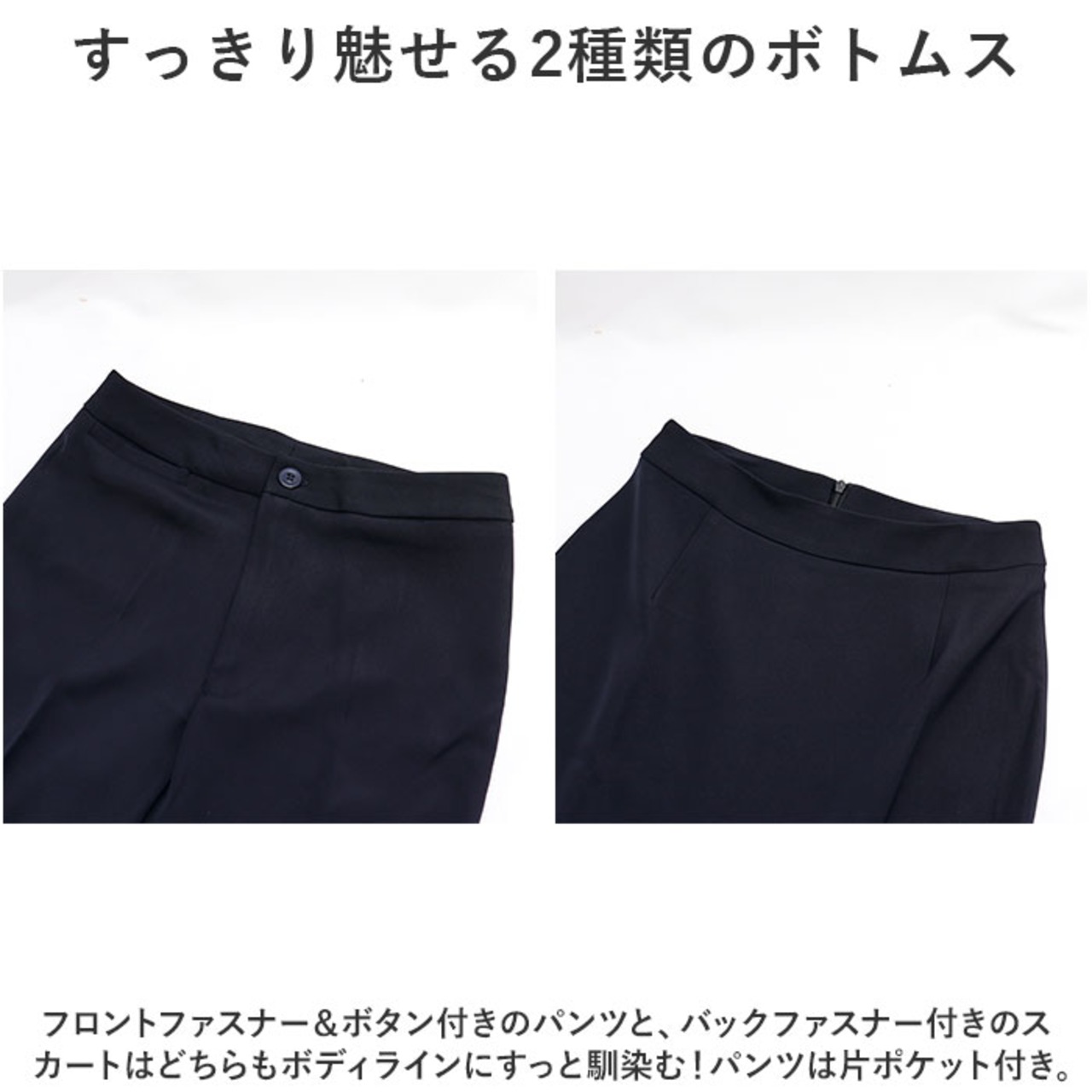 ・フロントファスナー&ボタン付きのパンツと、バックファスナー付きのスカートはどちらもボディラインにすっと馴染む!パンツは片ポケット付き。